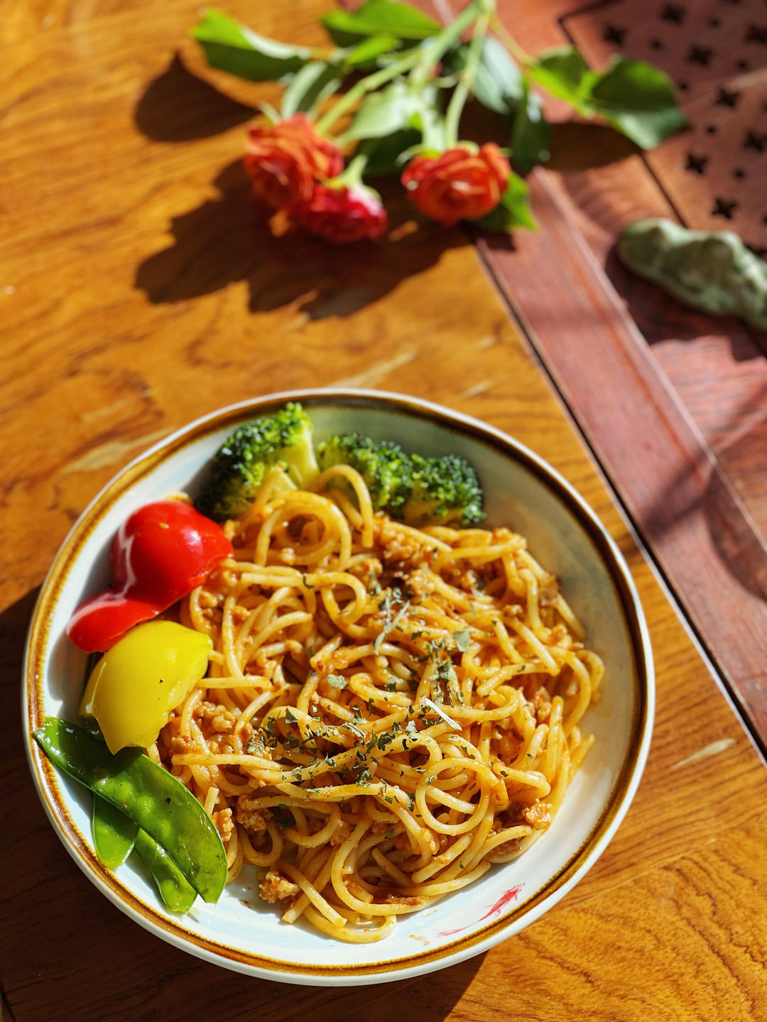 意大利面,拌秋葵,清炒荷兰豆彩椒,燕麦板栗可可豆浆
