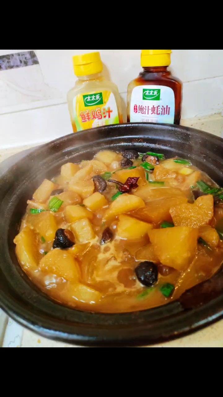 素菜香菇焖萝卜《萝卜2根清洗干净去皮切小块,起锅烧油倒入生姜爆香倒入八角桂皮,香叶炸香...