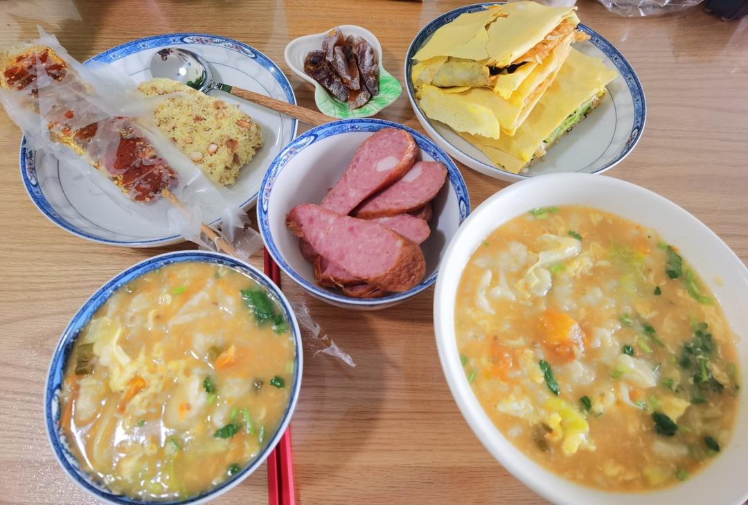 疙瘩汤,大煎饼,小米酥,糖葫芦,柿饼,红肠,乱七八糟摆一桌,开饭。