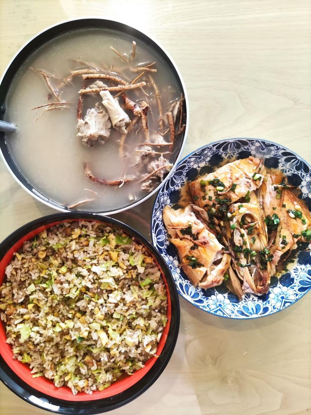 橄榄菜肉末包菜鸡蛋炒饭、五指毛桃鸭肉汤、生姜香葱焖大扒皮鱼