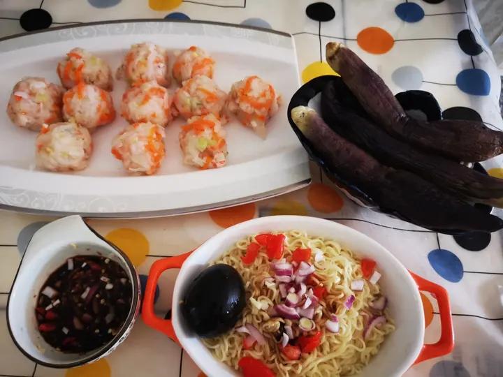 虾仁白萝卜蒸丸子 蒸茄子 松花蛋 碗面