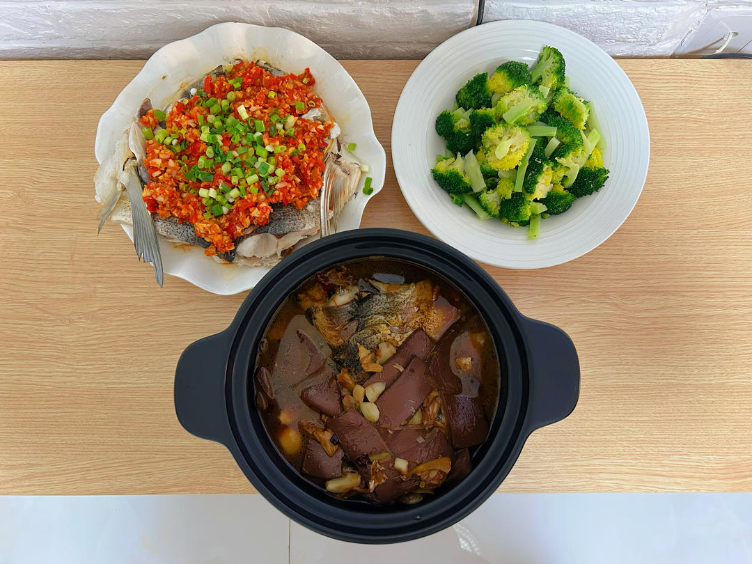 一鱼两吃,剁椒鱼头,炖鱼尾,水煮西兰花。