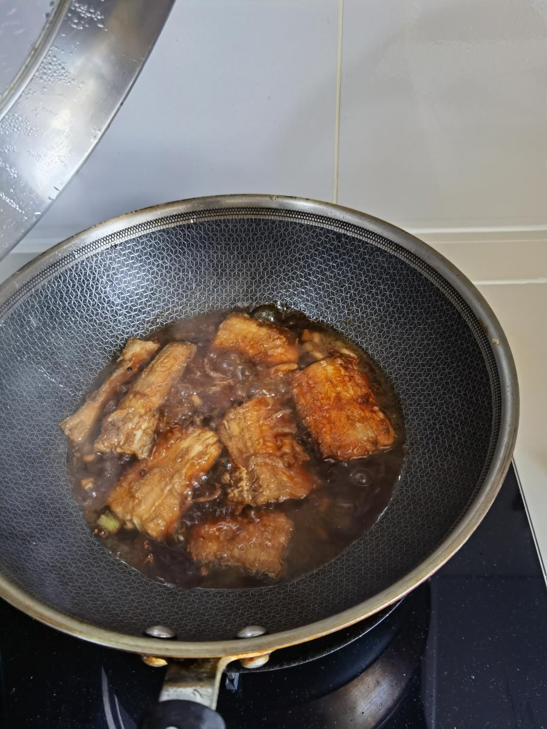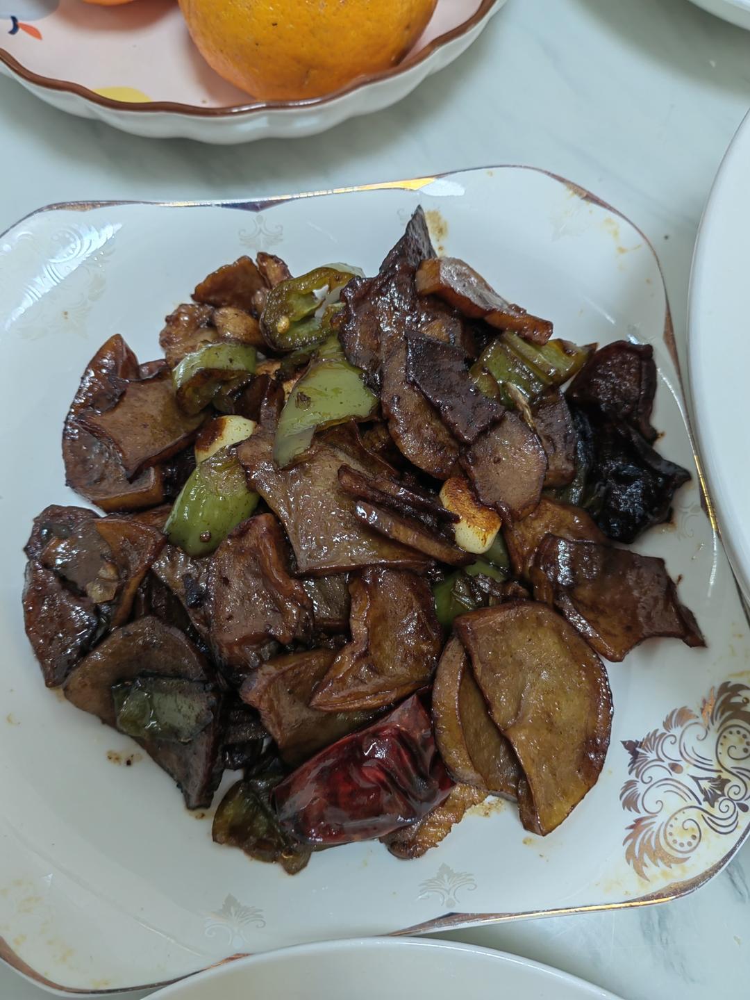 五花肉青椒炒干土豆片,一个不小心酱油倒多了,颜色深,爸爸最喜欢吃干土豆片了,倒点水稍微焖...
