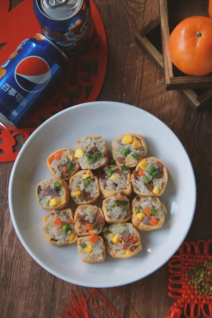 自家灌的香肠切粒和杂蔬丁、糯米饭炒香塞进油豆腐里上锅蒸十分钟。香糯软韧的豆腐盒搭配百事可乐你...
