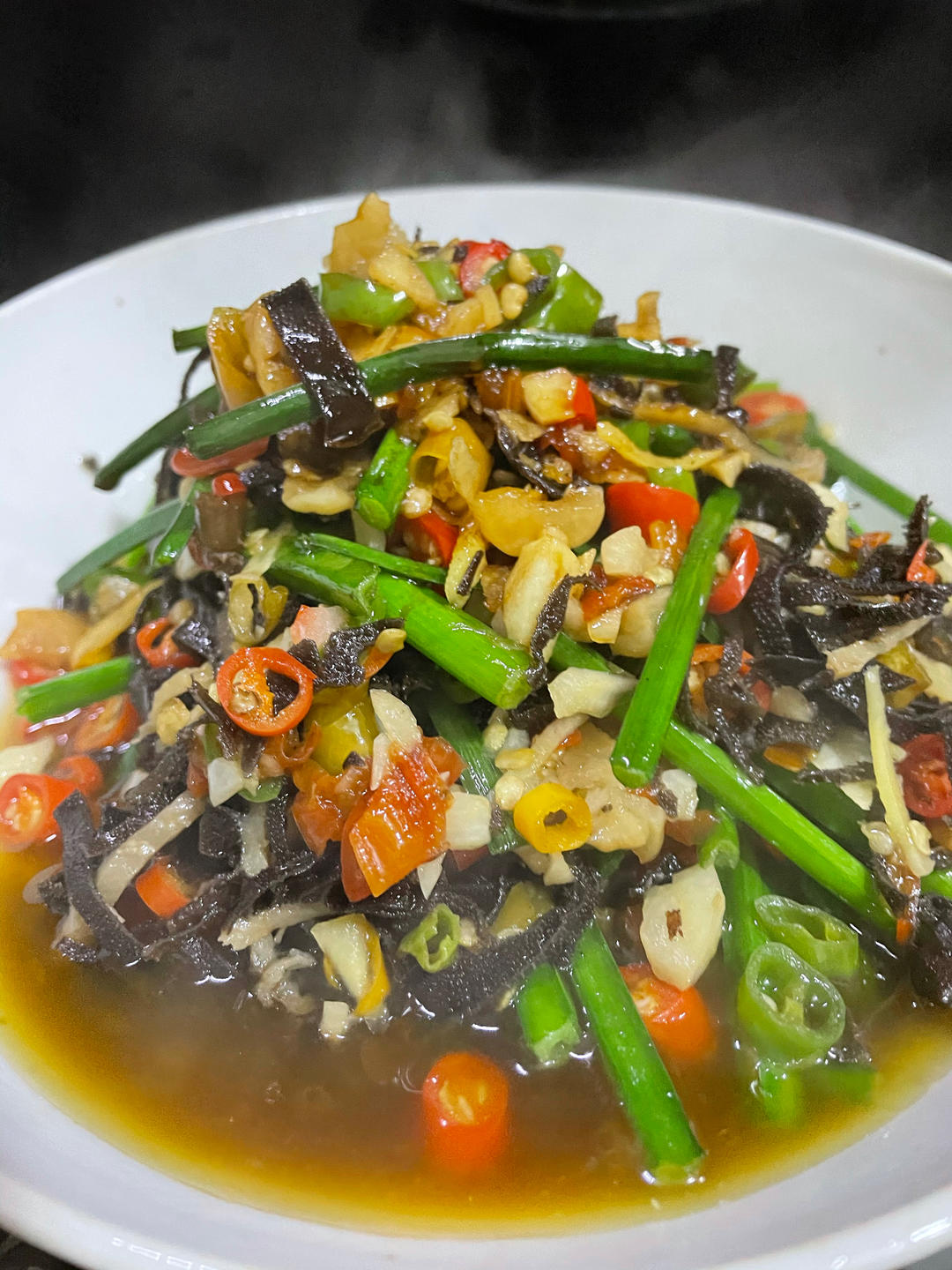 蒜苗炒白干,热锅热油,先放蒜苗加少许盐一个八角翻炒出焦香味,再放入白干一起翻炒1分钟,加...