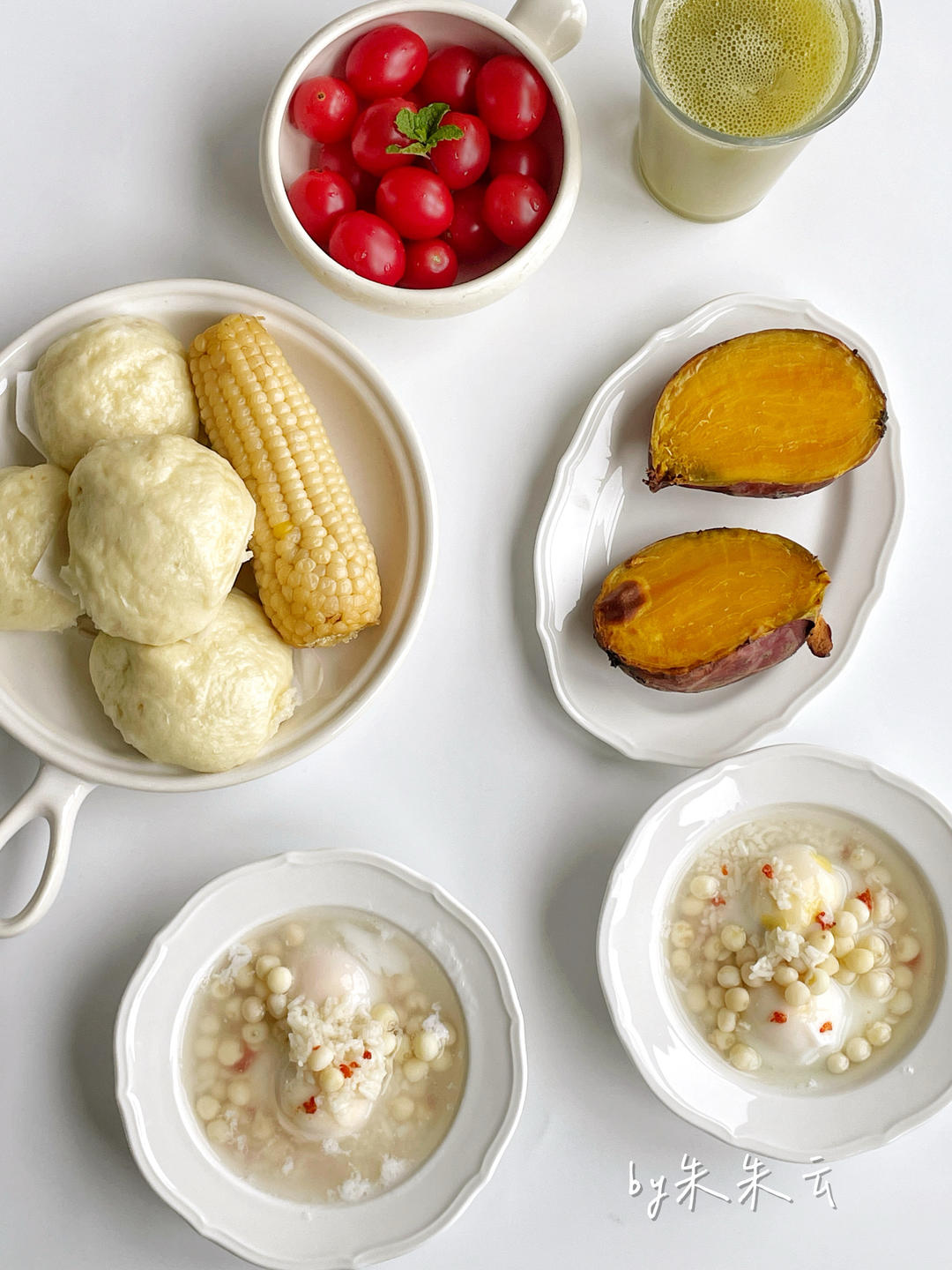 20240216有机西芹苹果汁+圣女果+烤地瓜+玉米+山药馒头+鸡头米水波蛋桂花酒酿。