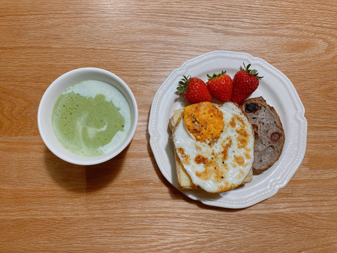 今日早餐:全麦芝士煎蛋三明治、乌梅子欧包片、草莓、抹茶牛奶