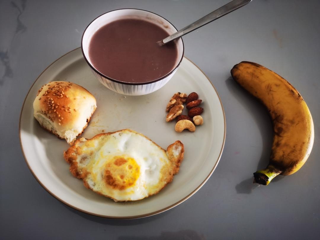 早餐是红枣紫薯山药小米豆浆+蒸红糖馒头、蒸鸡蛋+清炒生菜