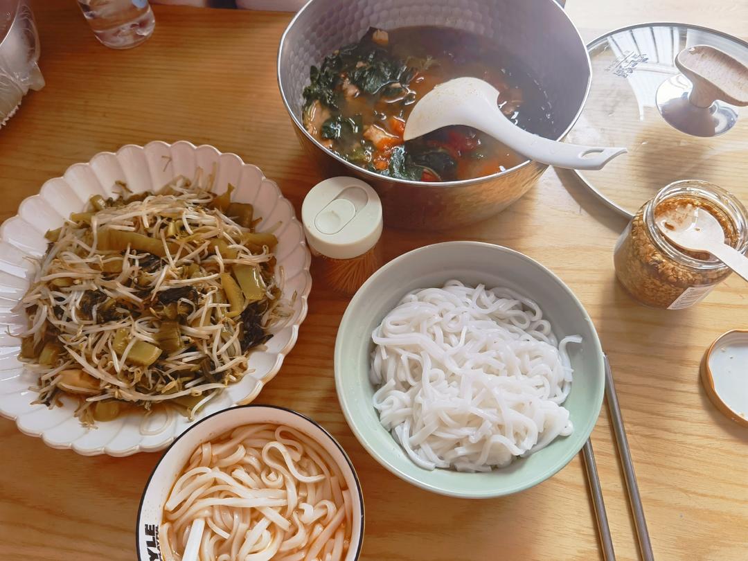 番茄枸杞叶猪肉汤,酸菜豆芽!