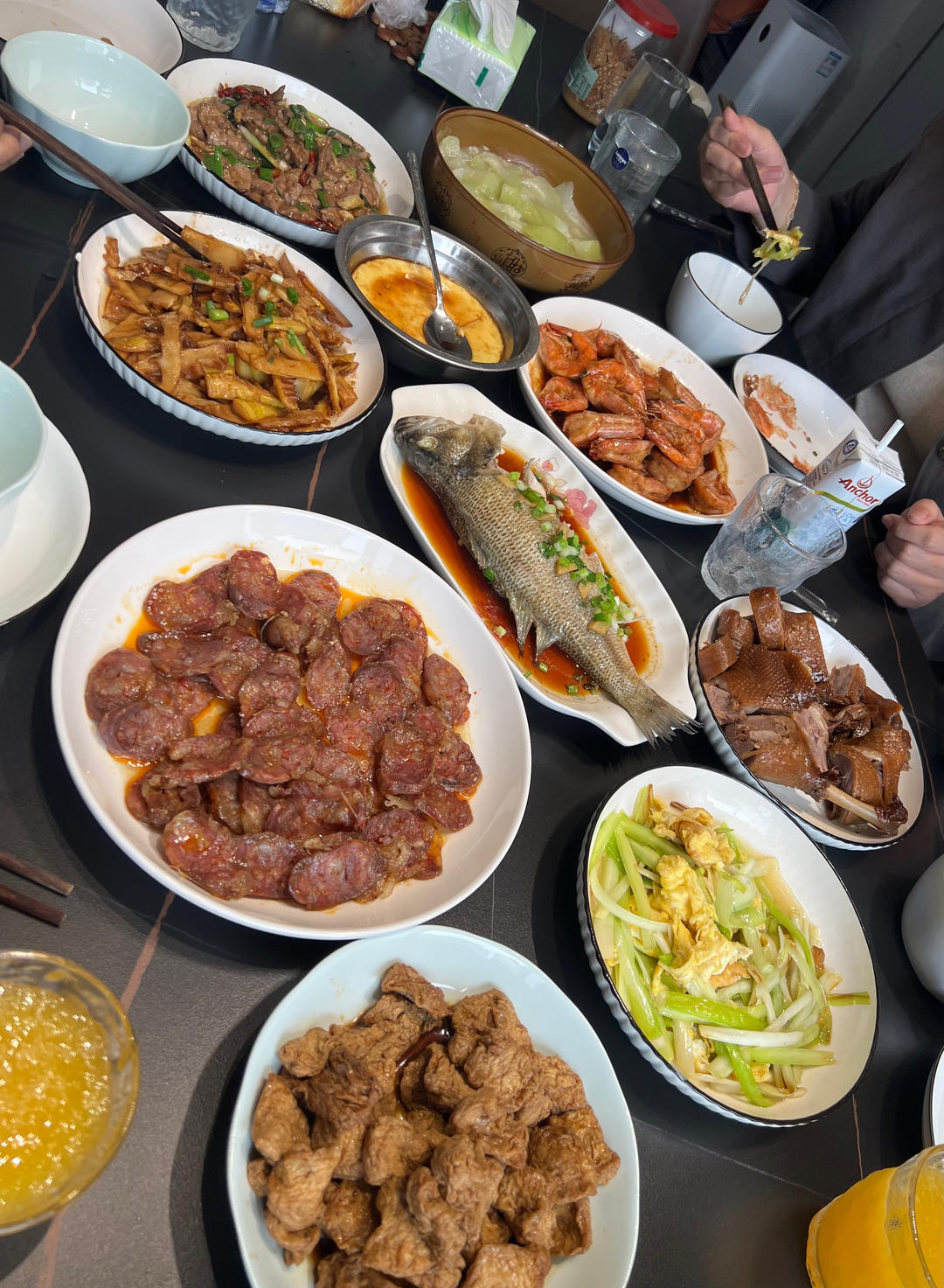 今日做菜,拍了个全家福,还有个油爆猪肝。蒸了鲈鱼、麻辣香肠、鸡蛋,做了油焖春笋、韭黄炒蛋、地铺、油爆虾、油爆猪肝,买了酱...