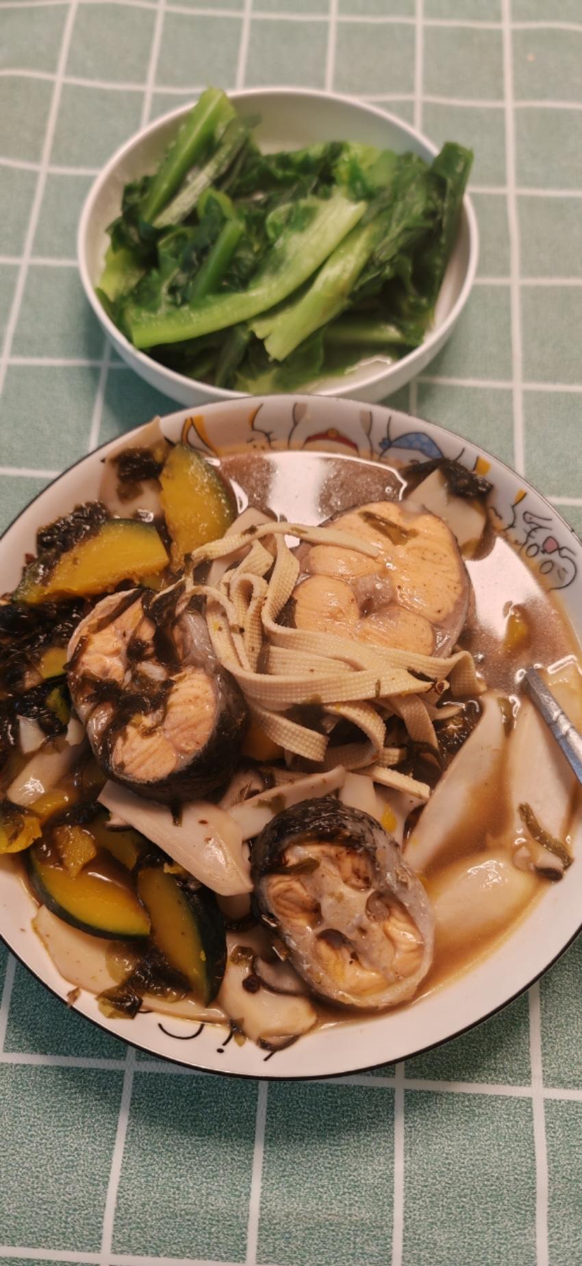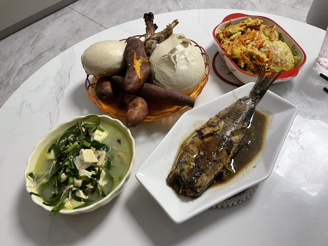 煎鱼🐟海带豆腐汤,土豆饼,地瓜,馒头
