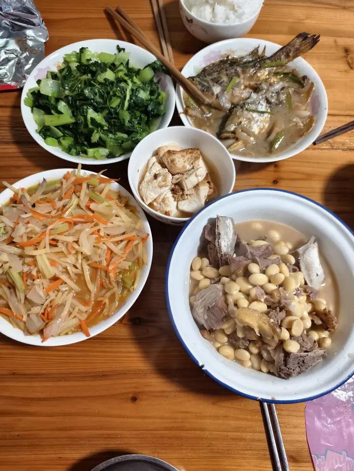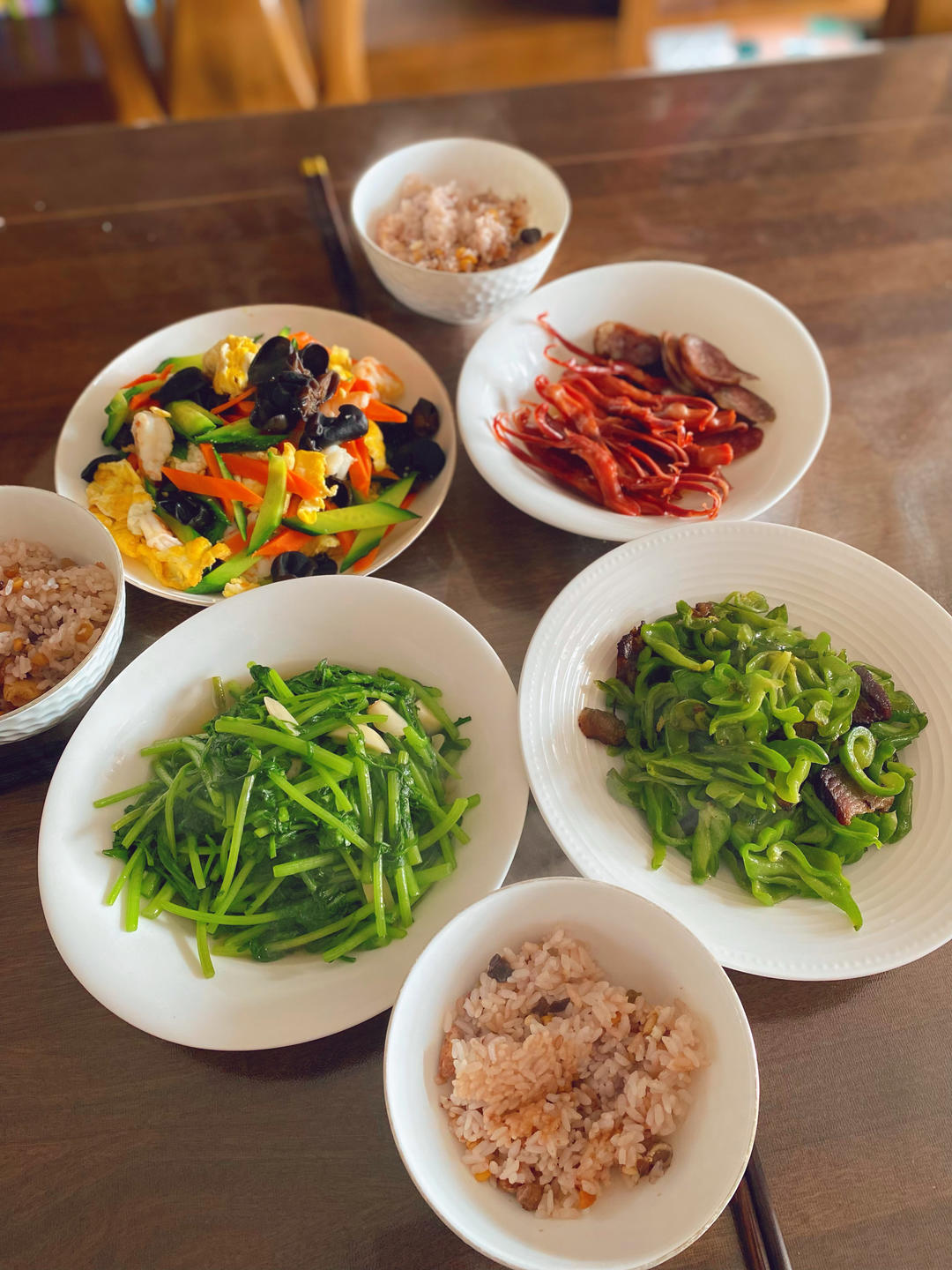 晚餐:时蔬炒虾仁🍤,青椒🫑炒腊肉,鸭舌,蒜香茼蒿,主食杂粮米饭