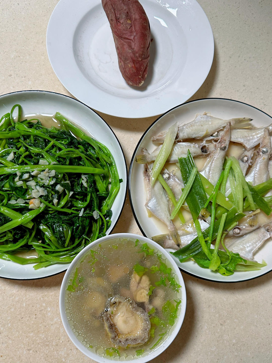石斛西洋参山药鲍鱼鸡汤,迪仔鱼,通菜,番薯。