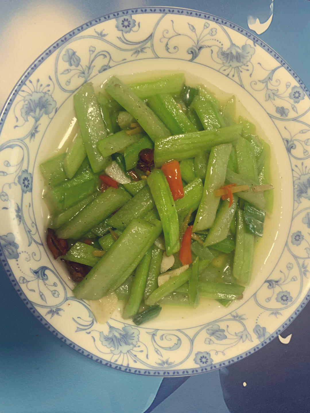 一根丝瓜,切条泡盐水防变黑,再加入比平时炒菜多一点的猪油,一小勺椒盐。
