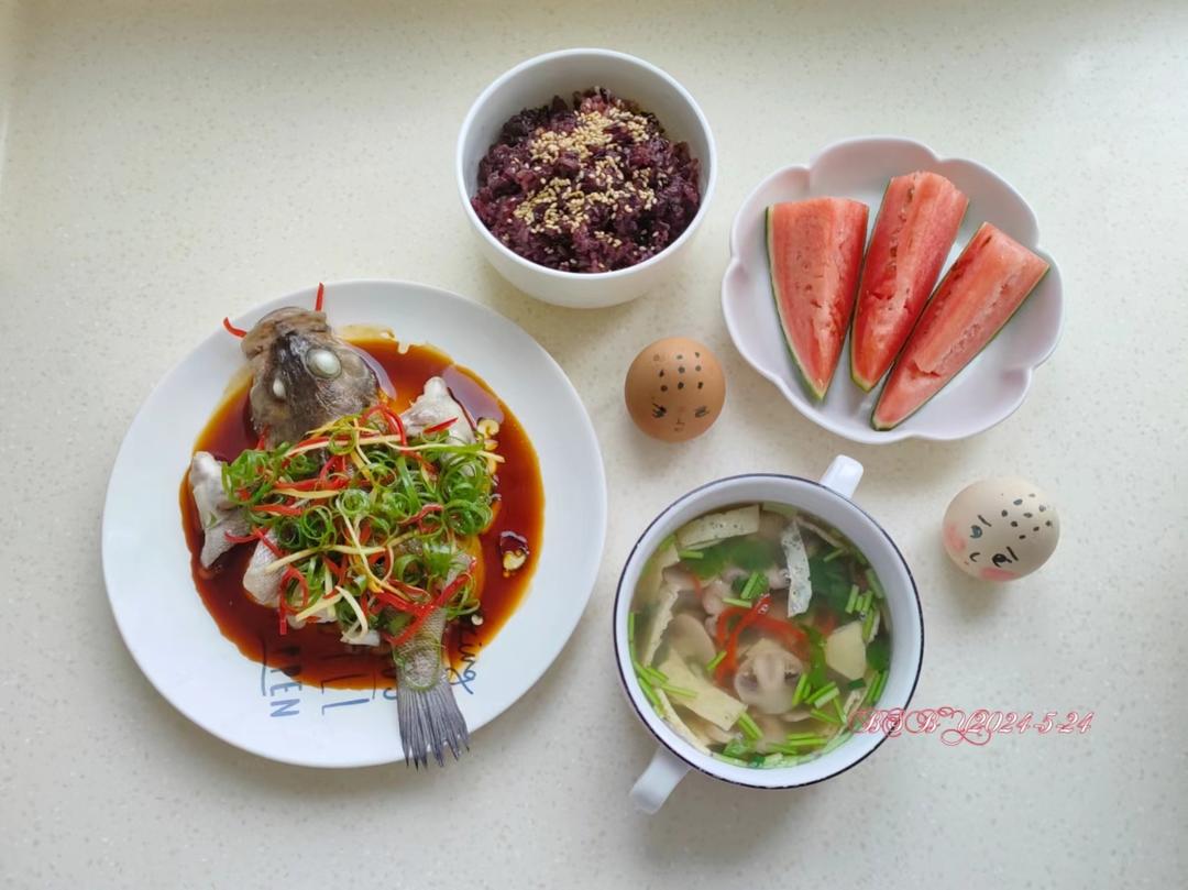 今日早餐:紫米米饭,清蒸黑鱼,口...