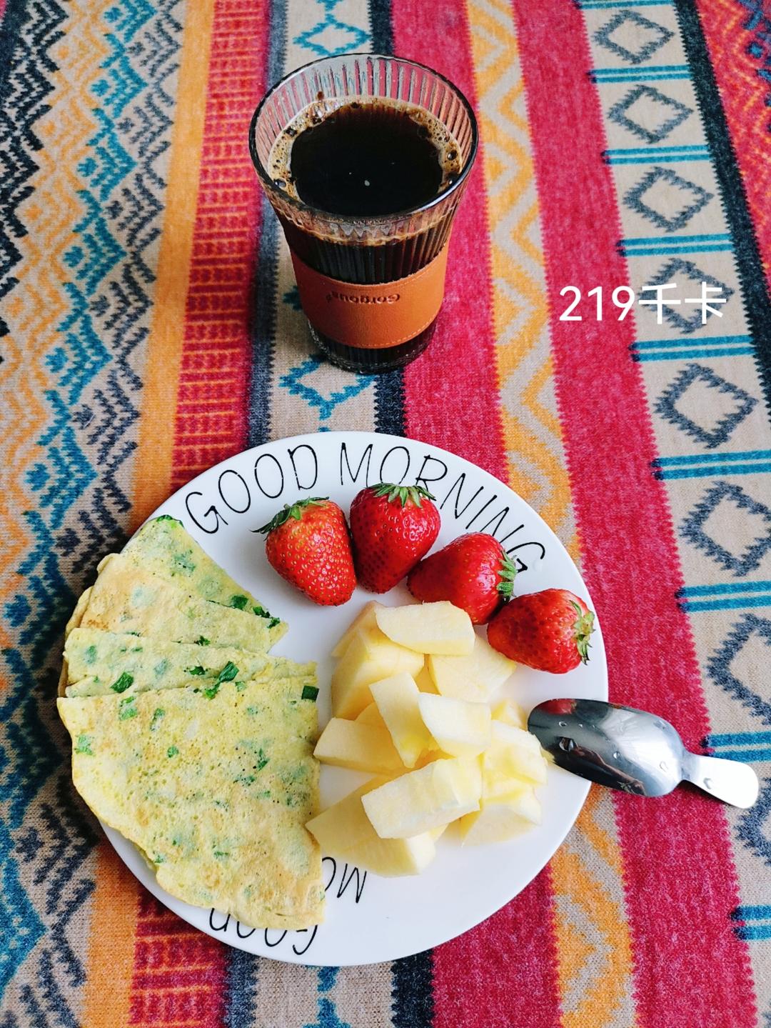 葱花鸡蛋饼+🍓🍎+黒咖啡