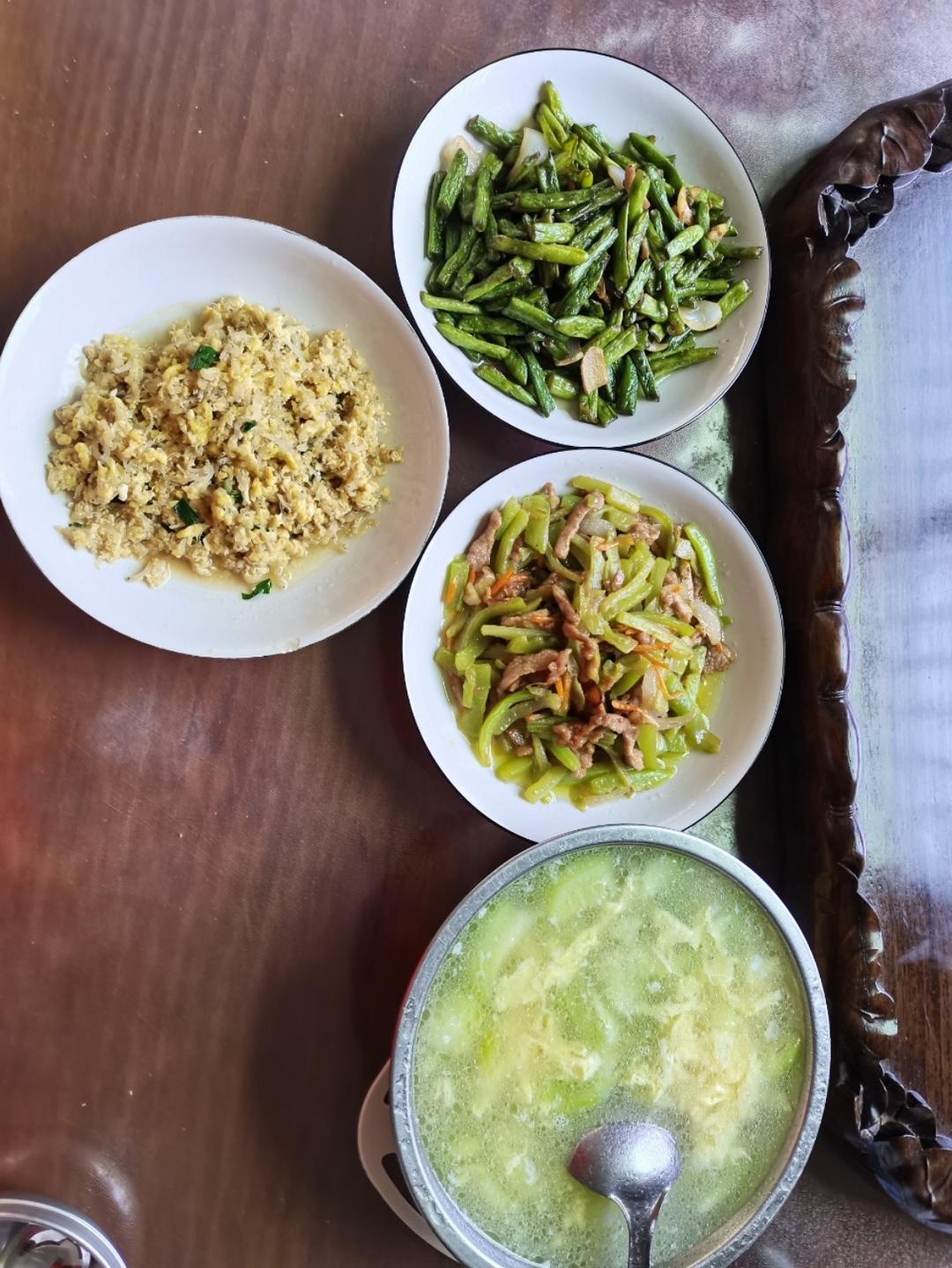 我做的新菜丁香鱼炒鸡蛋哈 莴笋炒肉丝 炒四季豆 丝瓜蛋汤