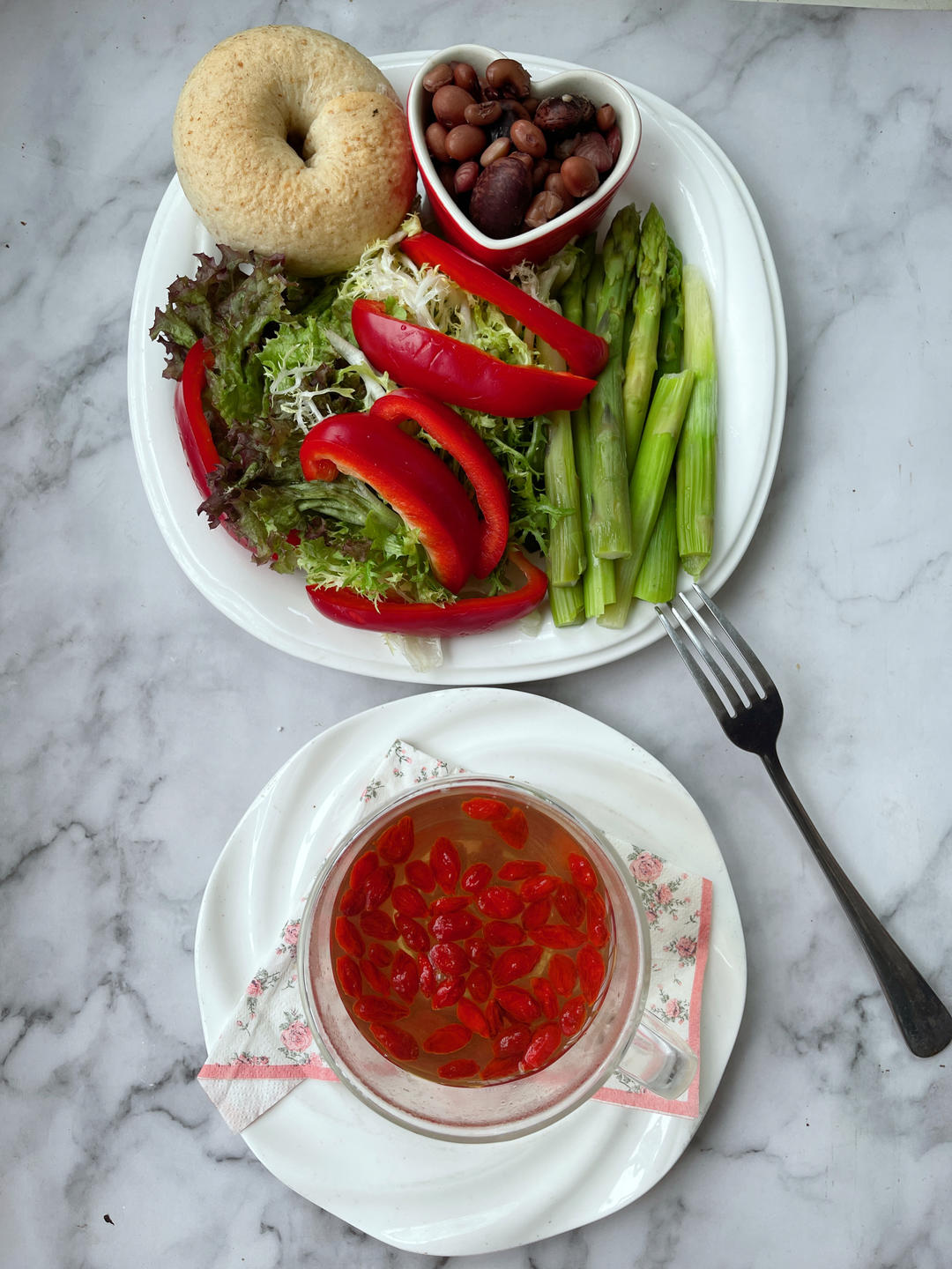 工作日早餐∶杂蔬+芦笋+彩椒+杂豆+全麦贝果+枸杞水。
