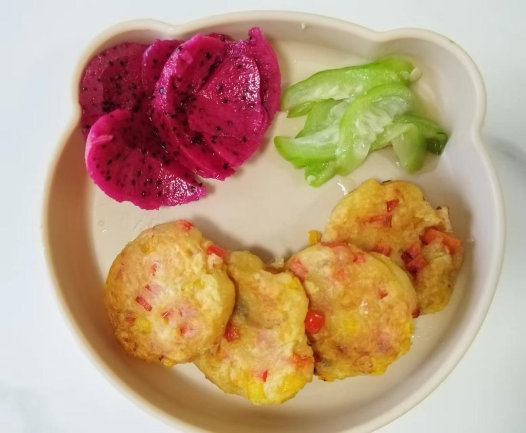 红薯彩椒饼,清炒丝瓜,火龙果