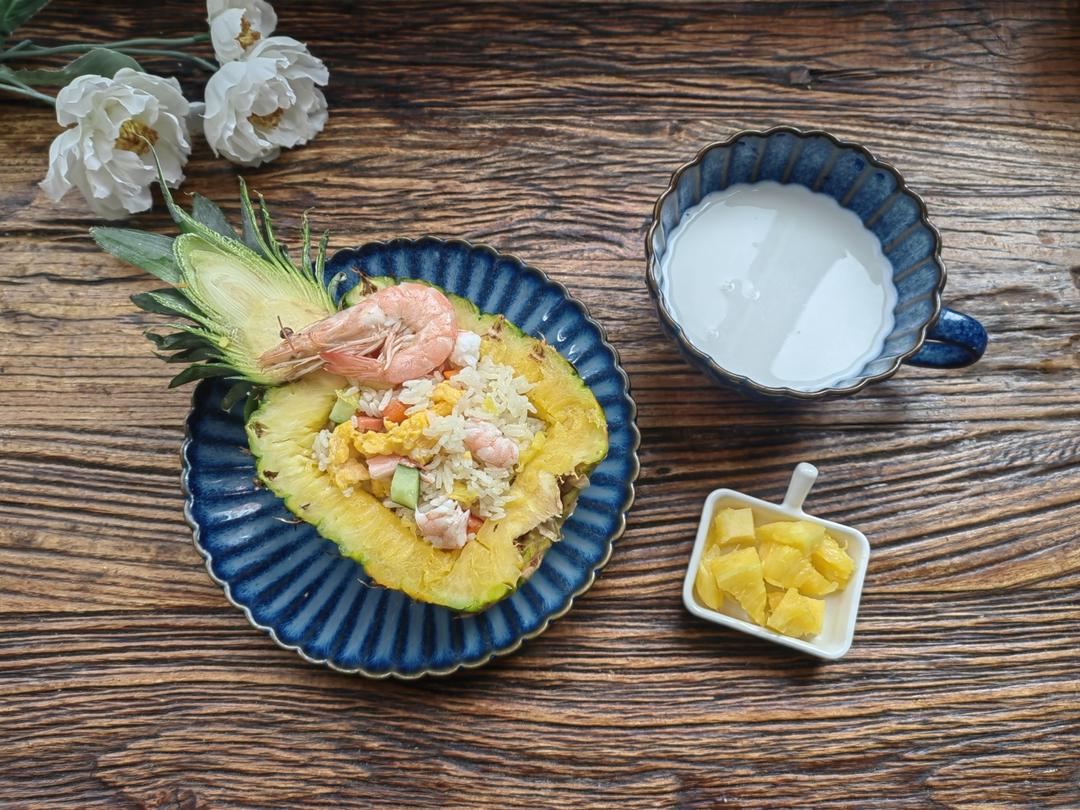 牛奶🥛+虾仁菠萝炒饭🍚+菠萝🍍