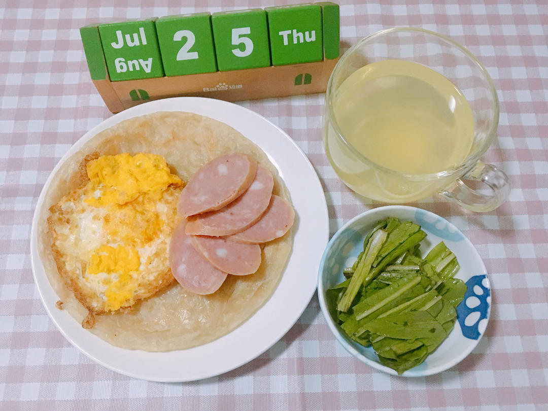 ㋆㏸放假第1️⃣8️⃣天 煎蛋🍳手抓饼加粉肠搭拌油麦菜配果珍🍹