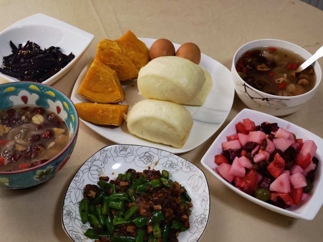 馒头、红薯、麻酱鸡蛋