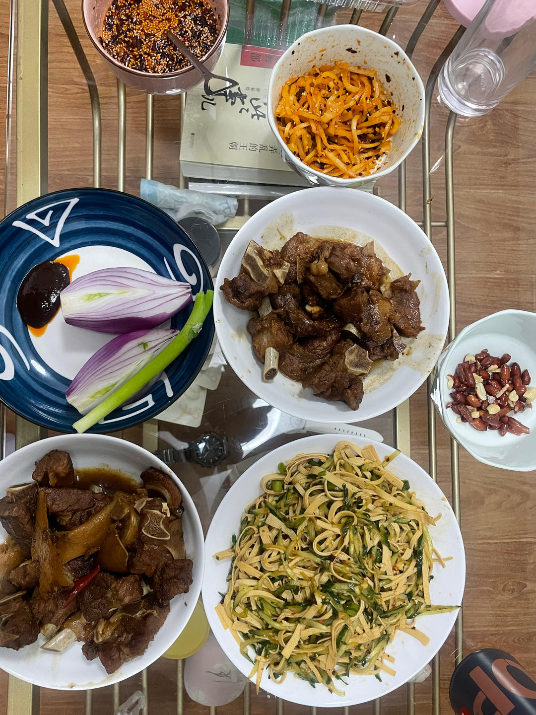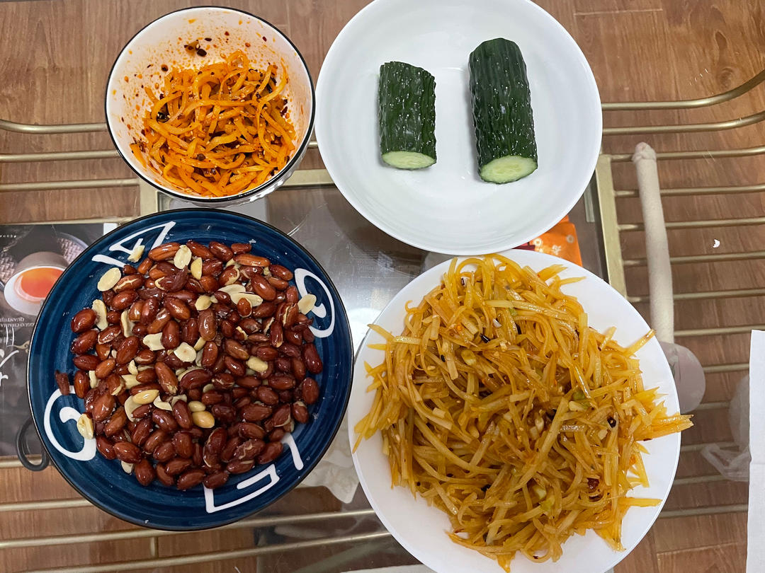凉拌土豆丝,花生米,芥菜丝咸菜。