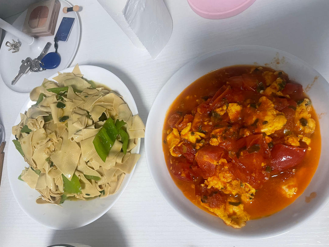 西红柿炒鸡蛋,干豆腐炒尖椒!
