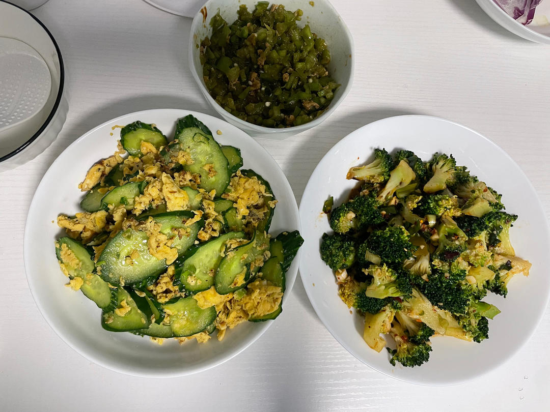 黄瓜炒鸡蛋,凉拌西蓝花,辣椒酱