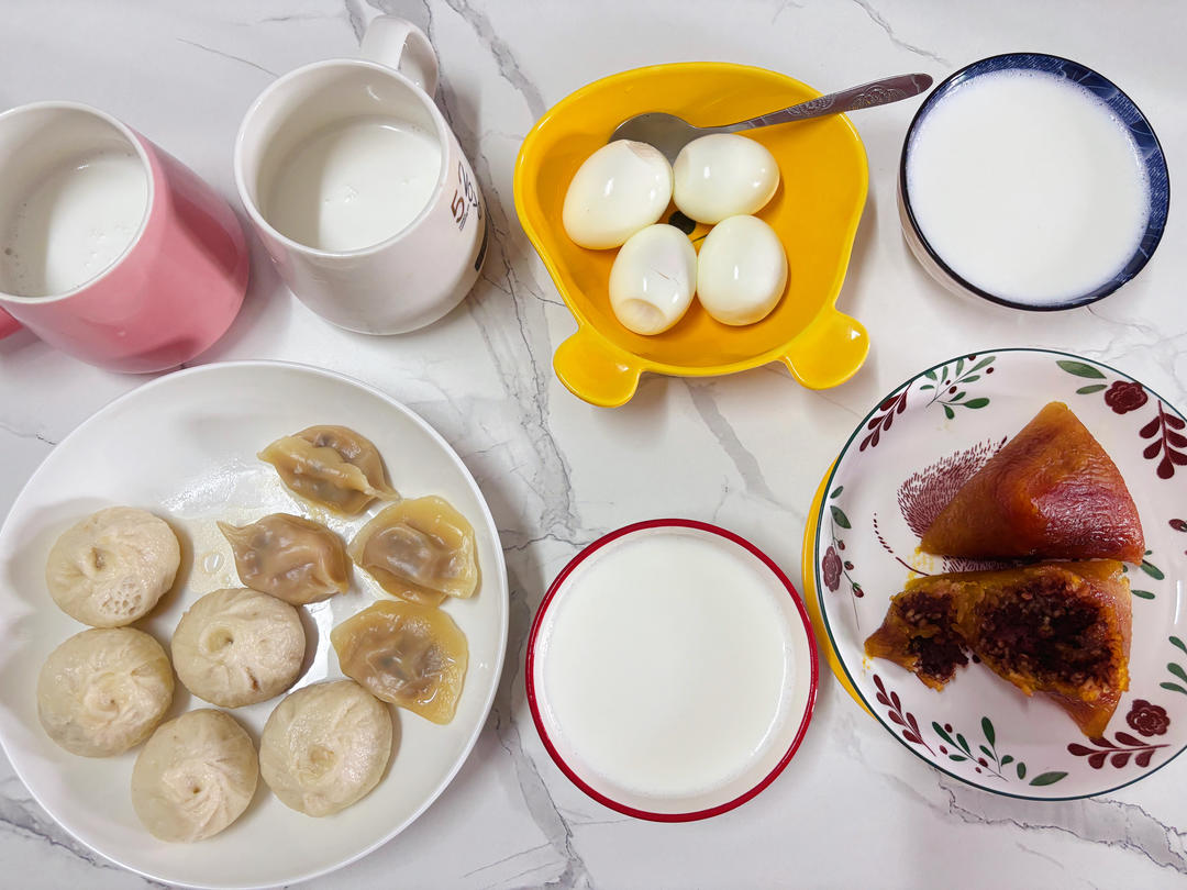 蒸了黑猪肉小笼包,三鲜饺子,土鸡蛋,还有妈妈包的碱水豆沙粽,给两姐弟冲了驼奶,我和老连喝高钙奶。