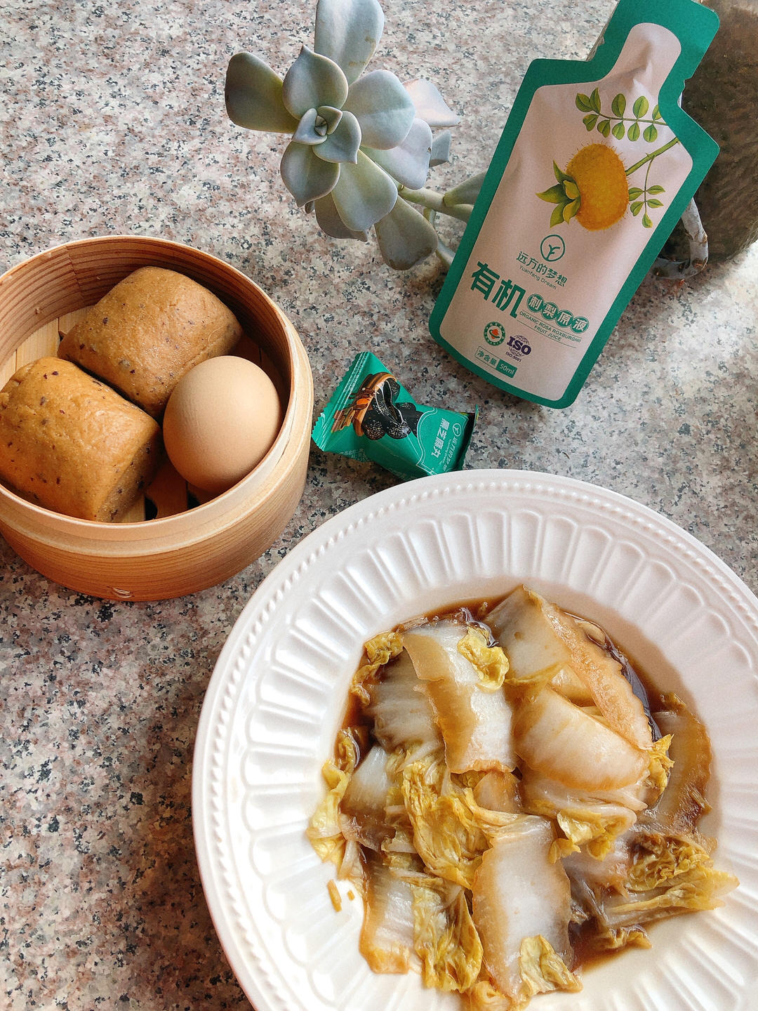 醋溜白菜➕山药红枣全麦馒头➕水煮鸡蛋➕刺梨➕黑芝麻丸
