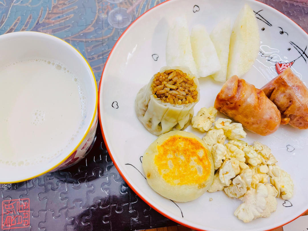 Day36.烧麦+煎烤肠+山药枣泥饼+核桃+秋梨+莲子百合饮(莲子、百合、银...