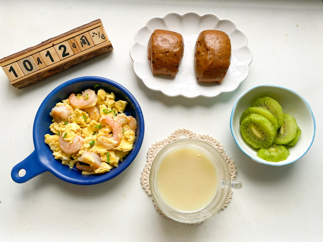 藕苹果小米打糊,虾仁滑蛋,红糖馒头,翠香猕猴桃