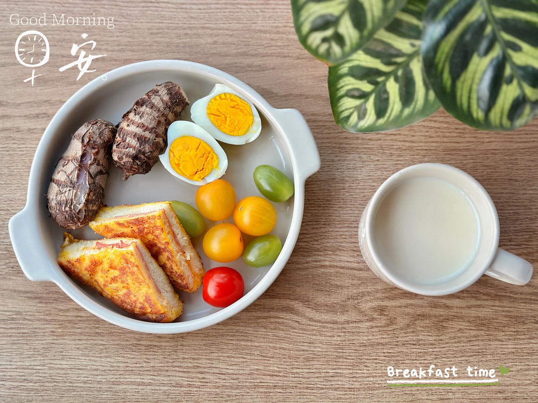 西多士+芋艿+鸡蛋🥚+彩色小番茄🍅+豆浆