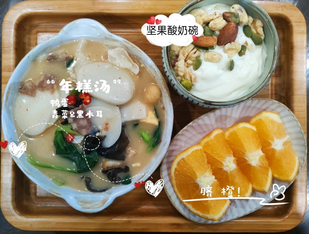 蔬菜鸭蛋年糕汤、坚果酸奶碗、橙子!