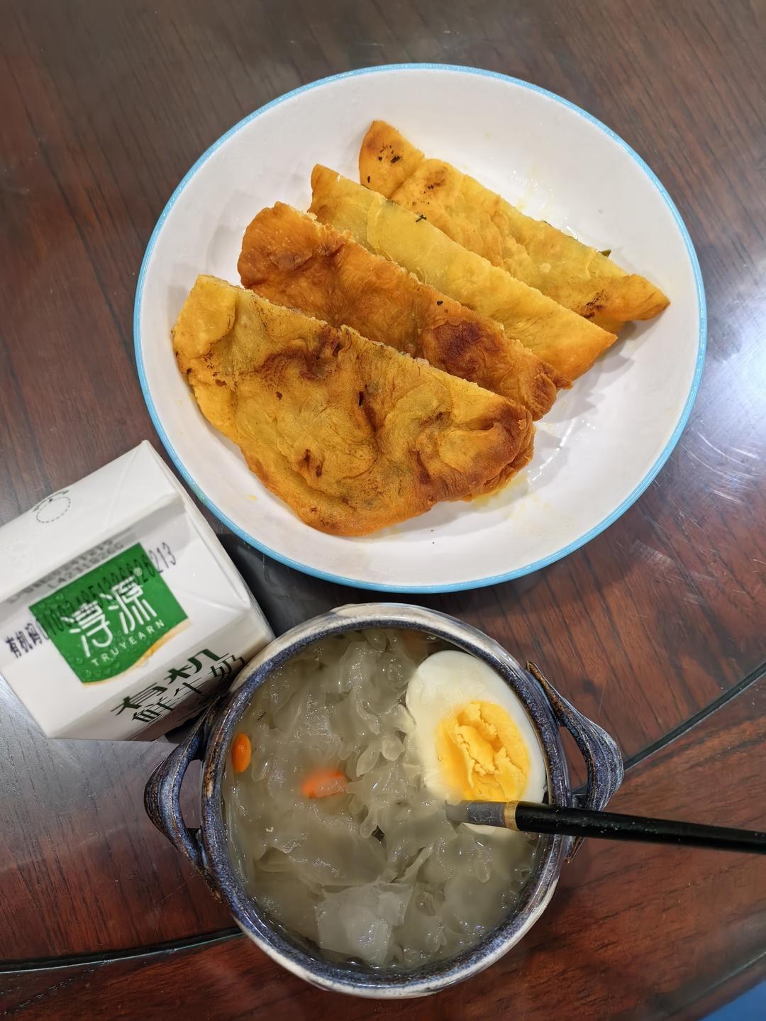 肉饼,银耳汤,白水蛋,奶