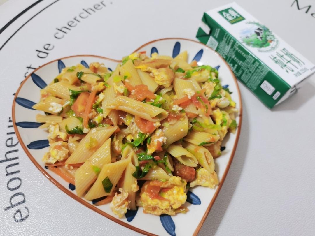 昨日份时蔬(西红柿🍅胡萝卜🥕鸡蛋🥚生菜🥬)炒空心面+牛奶🥛