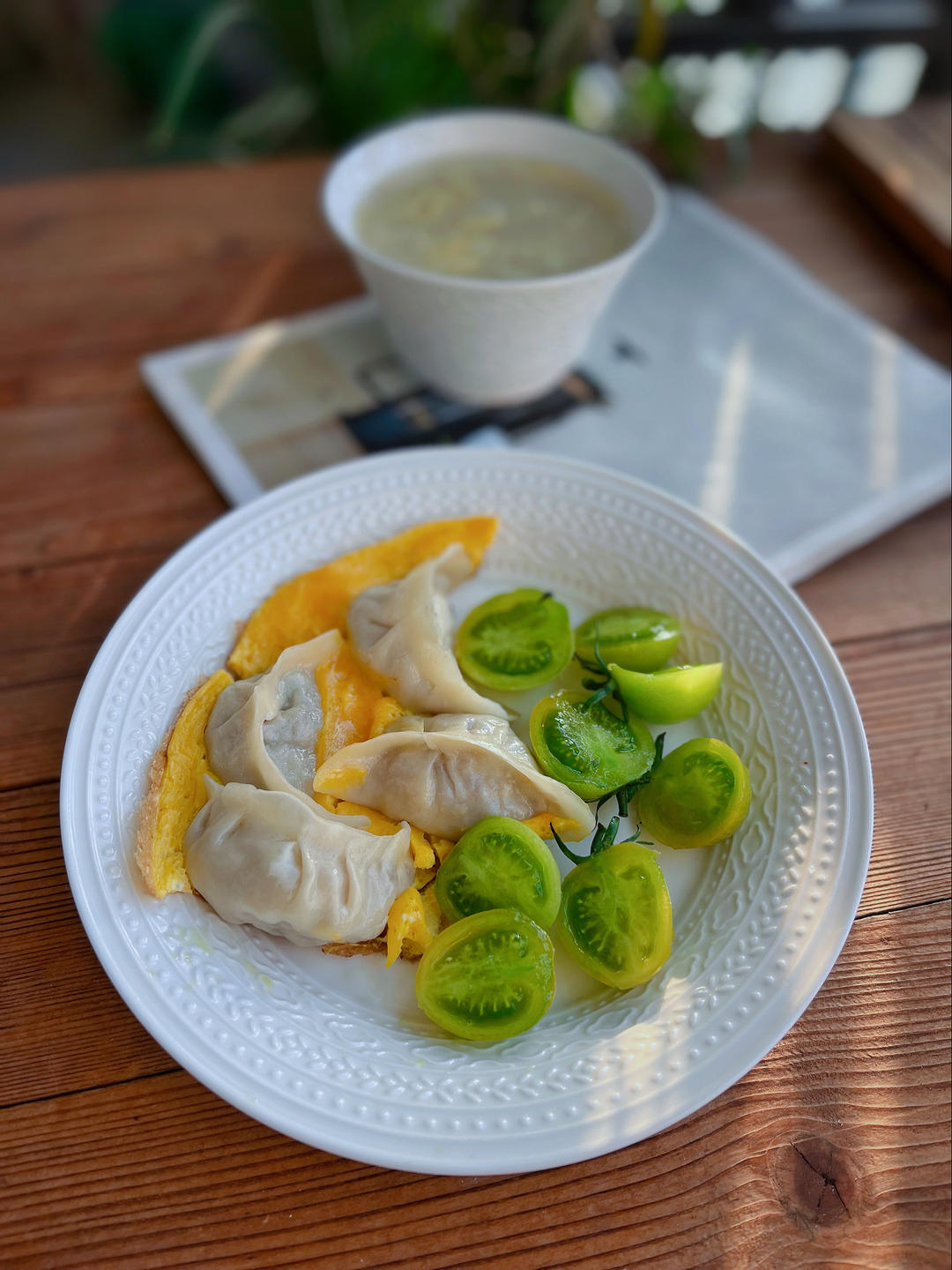 灿烂家早餐:菠菜豆腐馅饺子+饺子汤+海参+生巧牛乳包,今个冬至了,灿烂家长这边风俗吃饺...