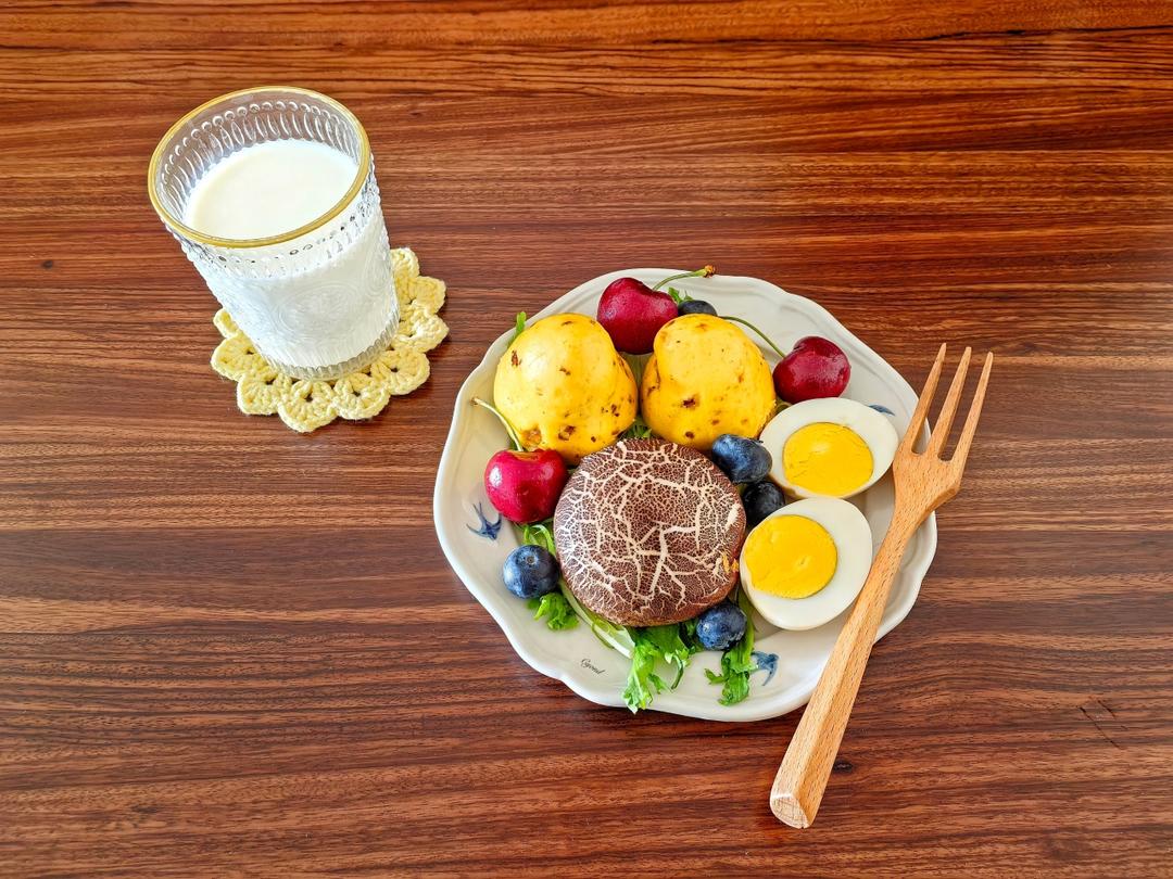 窝窝头+香菇包+鸡蛋🥚+车厘子🍒蓝莓🫐+纯奶🥛
