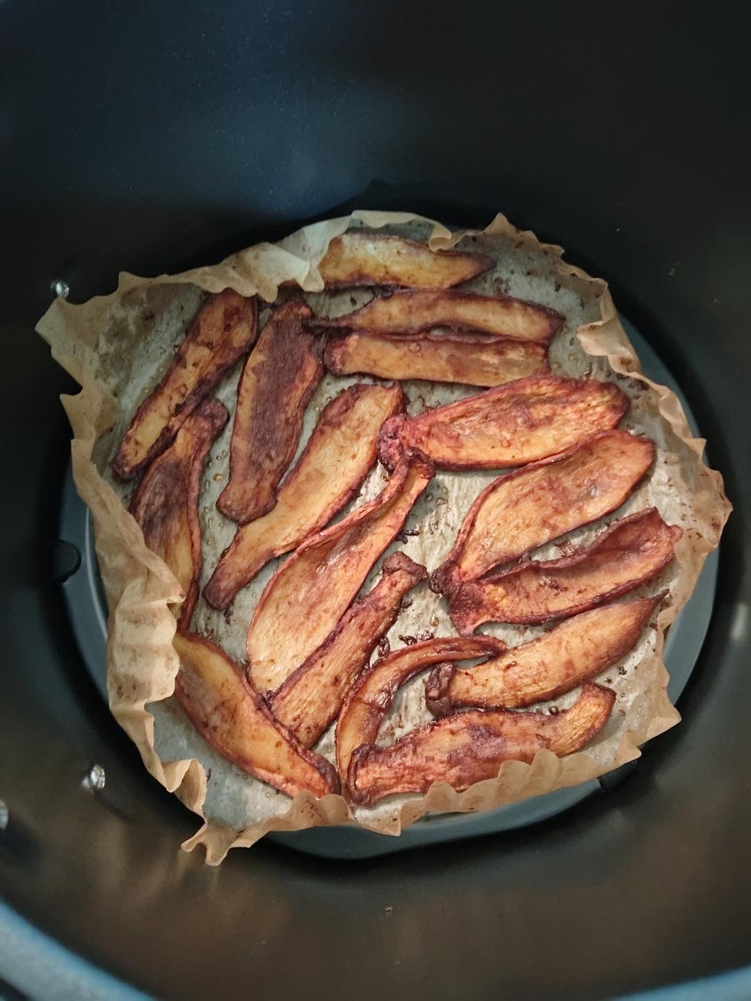 在空气炸锅里断断续续烘了有四十分钟,因为中途出水了,一直没变干,味道挺好的,加上杏鲍菇本身就比较有嚼劲,好吃。