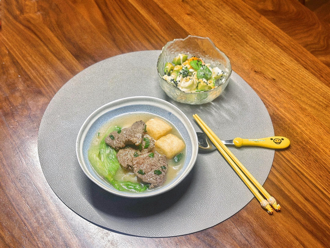 葱烧和牛鱼豆腐汤河粉,鸡蛋牛油果香蕉沙律