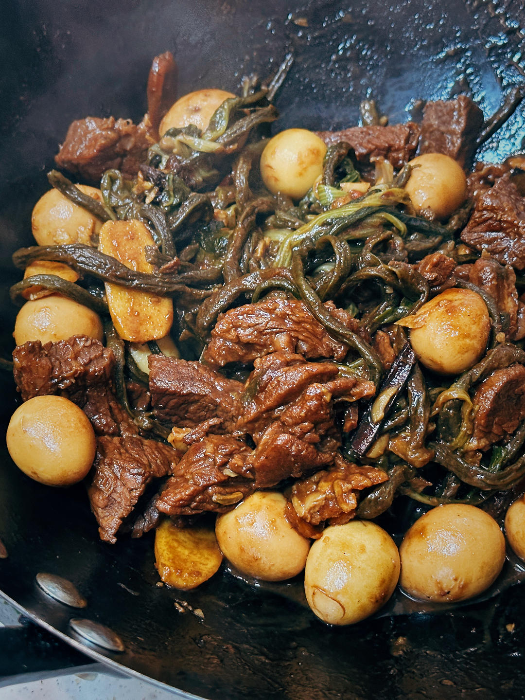 酱牛肉,加了干豇豆,小白菜,鹌鹑蛋,下饭菜。