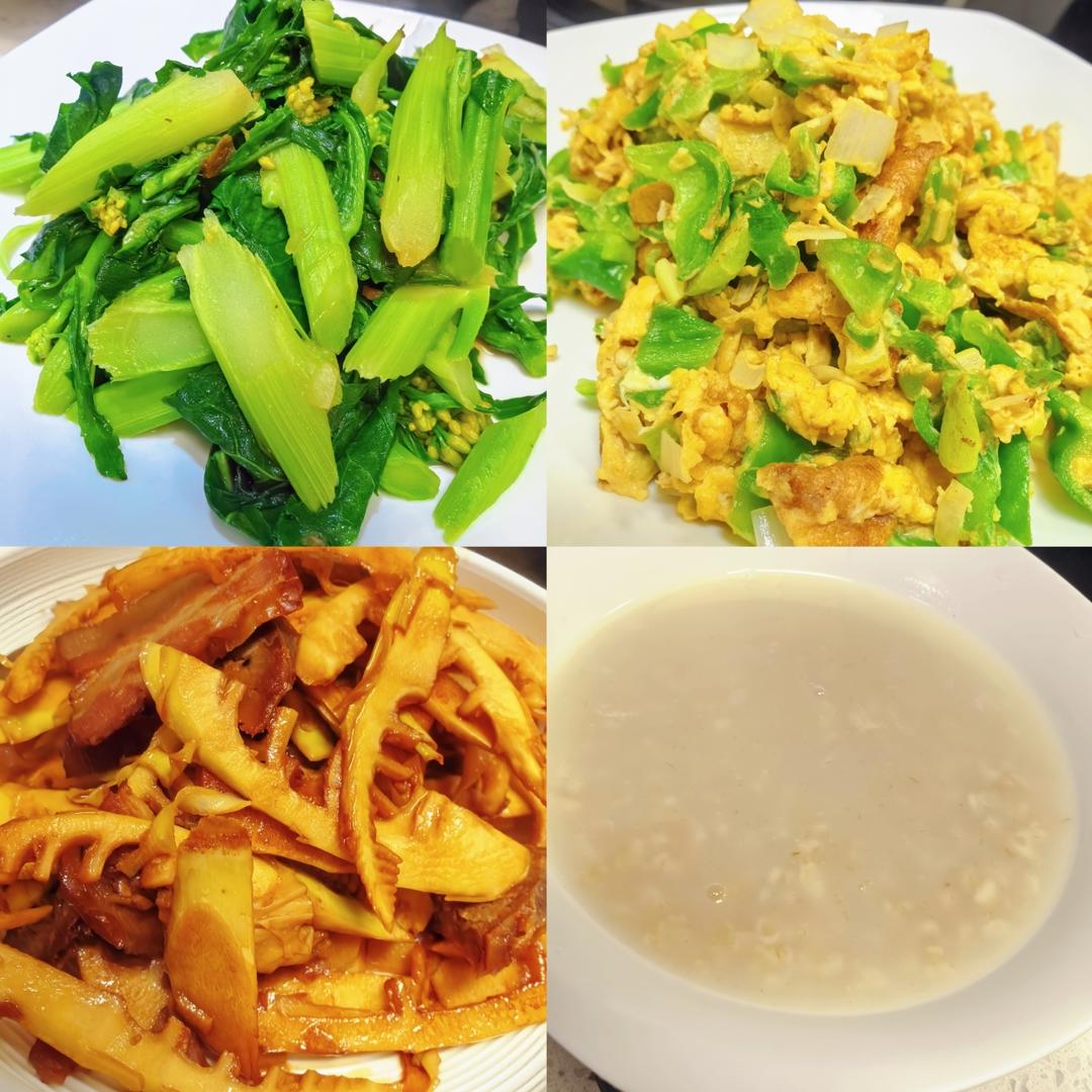 20250304 晚餐:炒菜心,辣椒炒鸡蛋,腊肠腊肉炒竹笋,燕麦粥,还有俩剩饼。