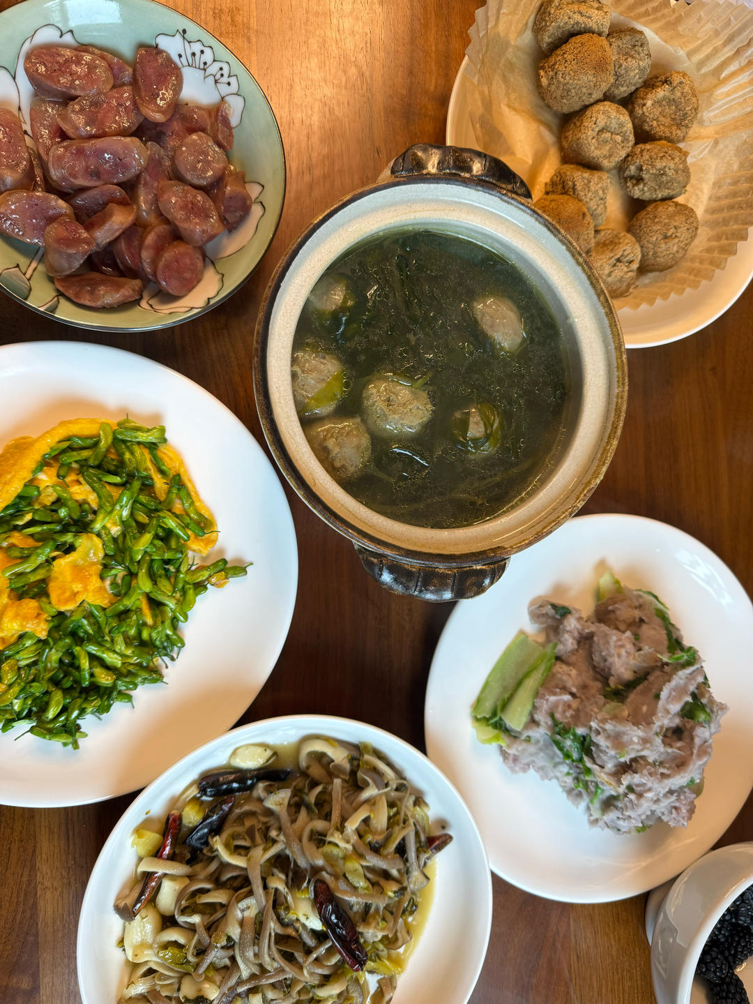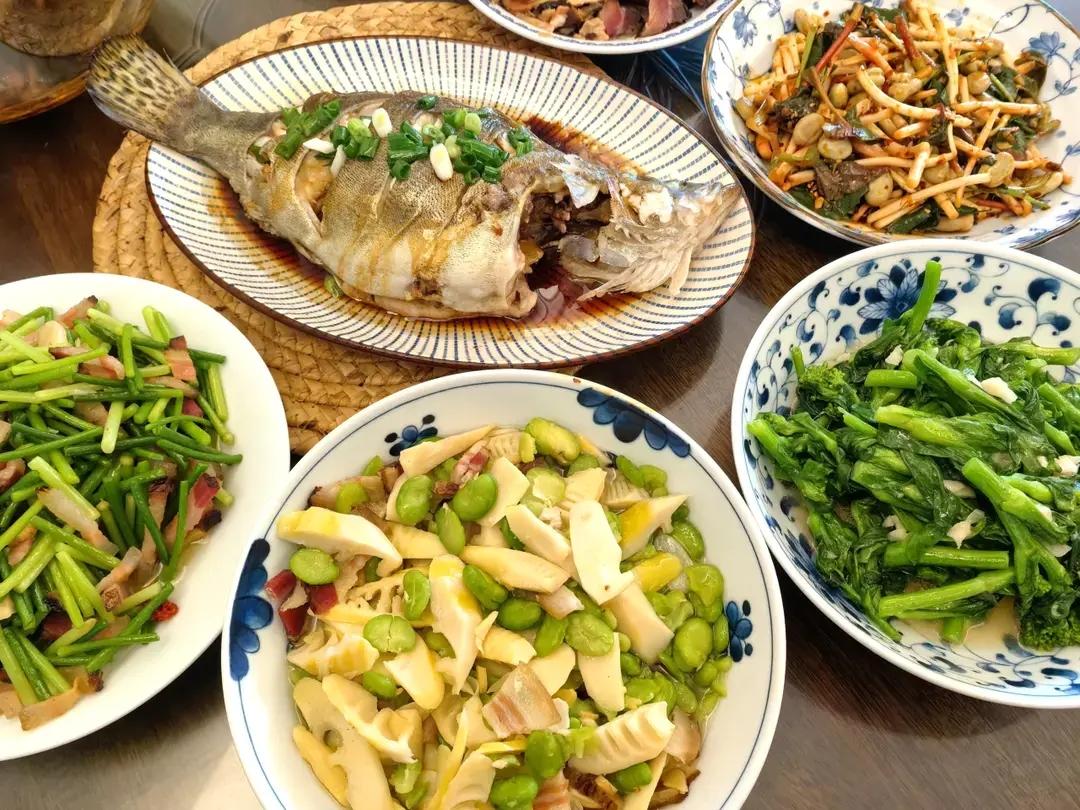 周日我们仨的午餐:春三鲜、蒜苔炒腊肉、折耳根拌胡豆、蒜香小油菜苔、清蒸鳜鱼。早上去大菜市...
