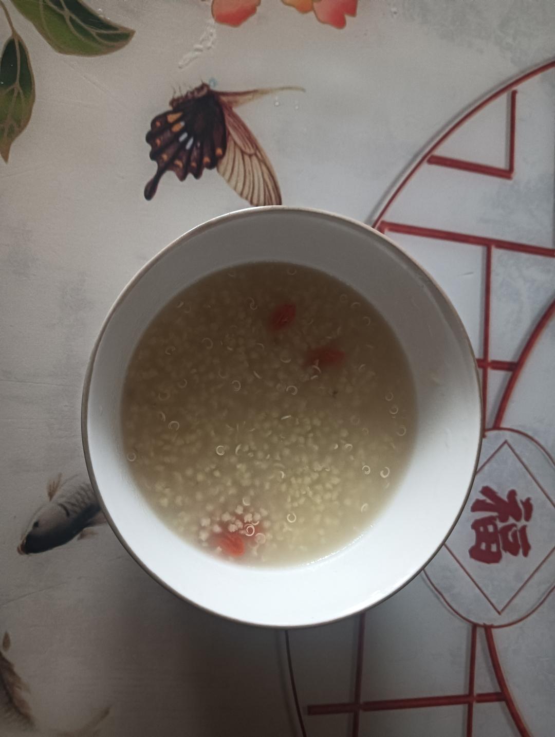 小米+有机白黎麦+枸杞子+1克椰子油煮粥。