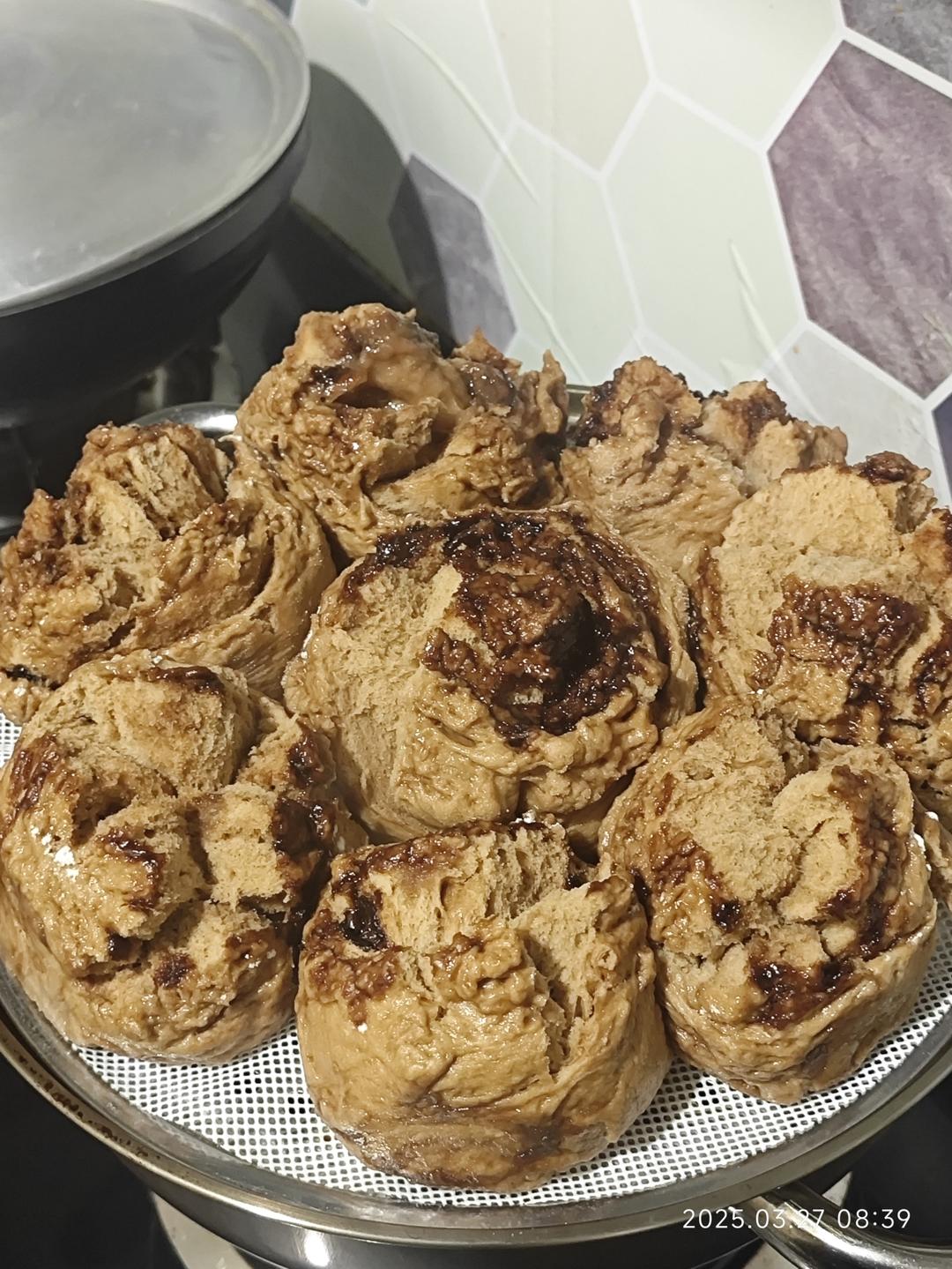 除了二发前再包一次红糖进去,是参考别的博主的,其余都按照博主的比例方法。开花成功,不过有点粘手,揉面又撒了好多面...