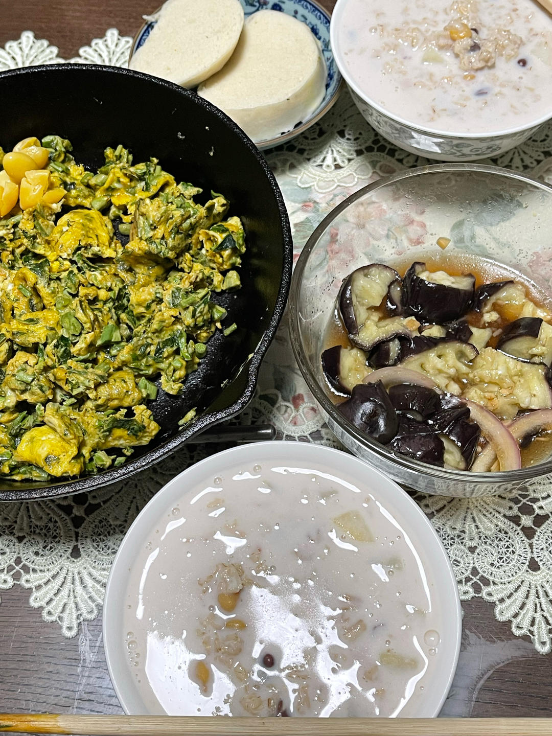 今日早餐:苹果牛奶燕麦片粥+红豆+鹰嘴豆、馒头片、香椿炒鸡蛋、蒸茄子