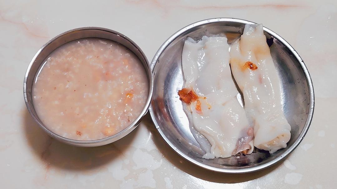 小学鸡の快手早餐,花生烧骨粥➕叉烧肠粉