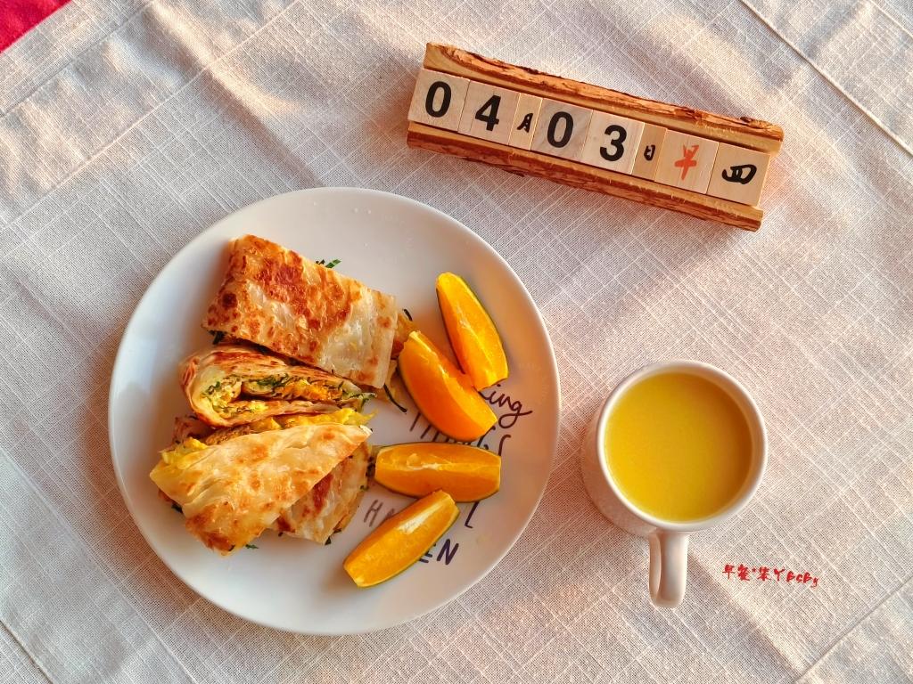 继续简单的早餐:一张手抓饼,一个鸡蛋,一把野蒜苗,一点贻贝肉组合成一个饼夹,再搭着玉米汁,橙...