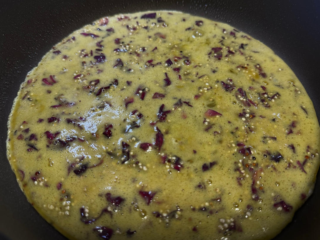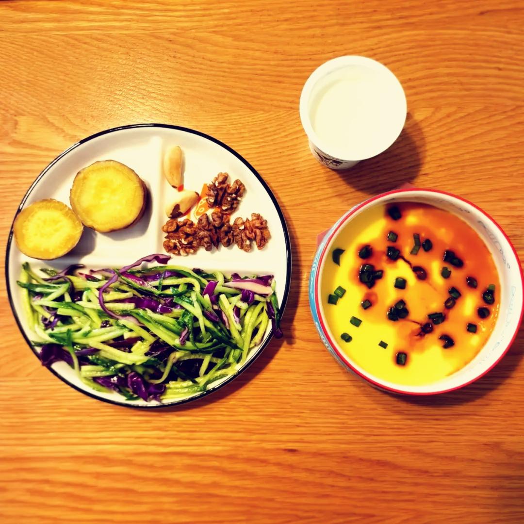 亚麻籽油拌紫甘蓝黄瓜丝,红薯,鸡蛋羹,无添加酸奶,核桃仁和鲍鱼果。